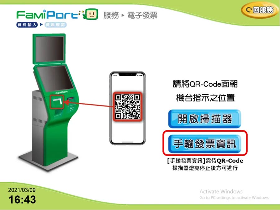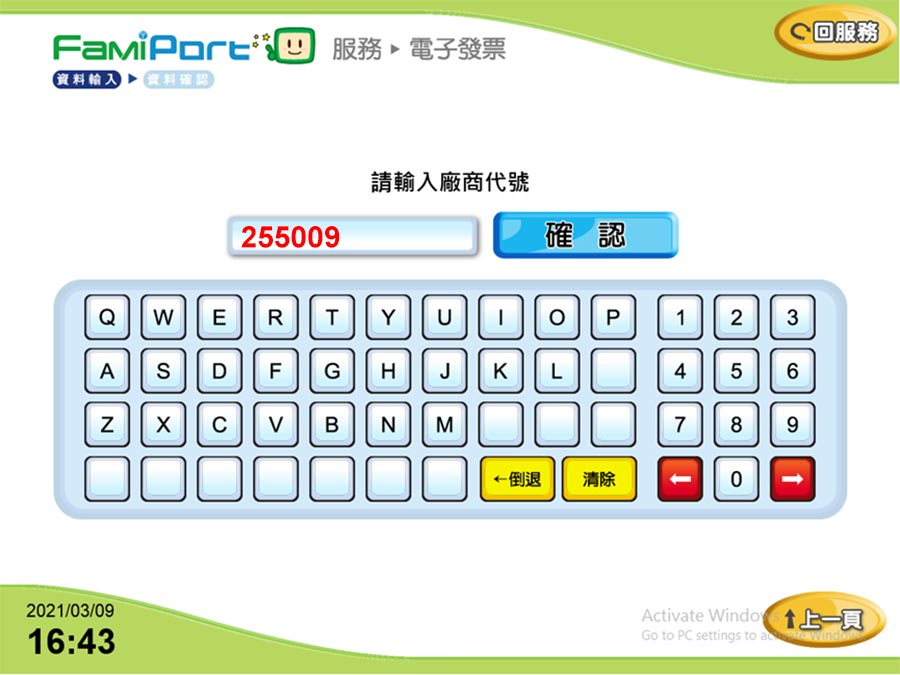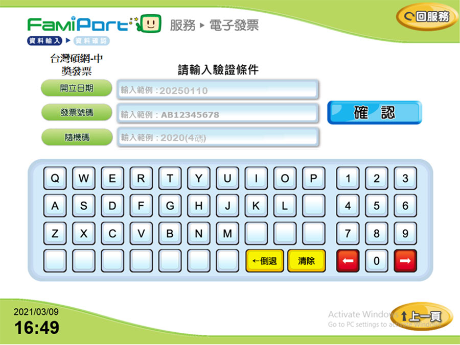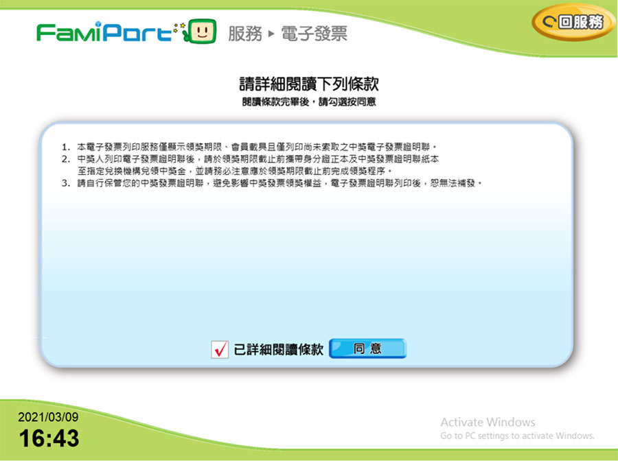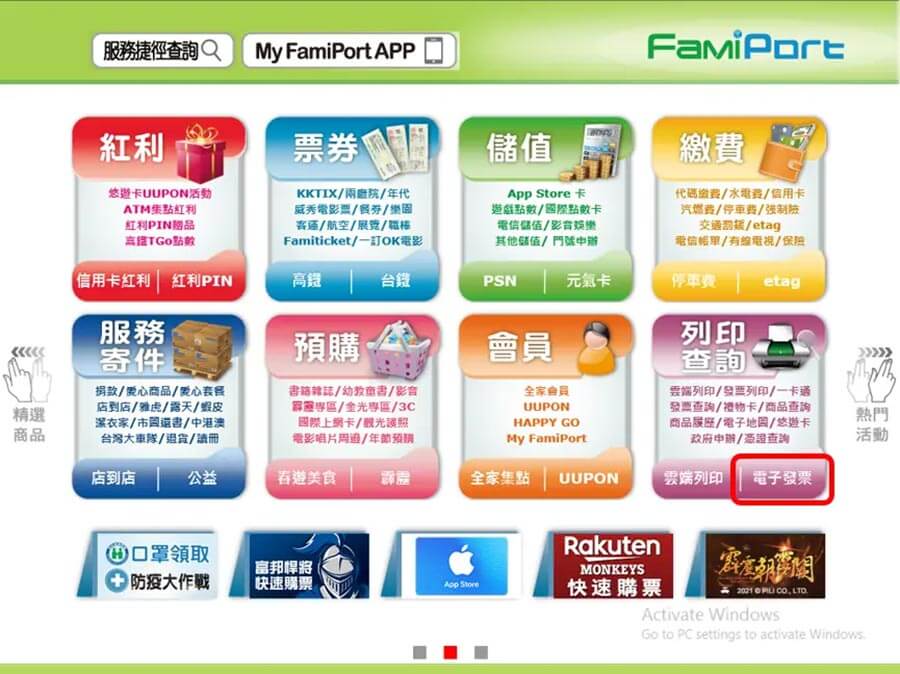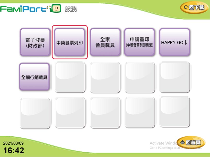 操作說明-全家 1. 至Famiport機台,首頁點選:列印查詢 > 電子發票。 2. 選擇中獎發票列印。 3. 勾選確認同意條款。 4. 選擇驗證方式。 5. 輸入So-net 廠商代號:255009,點選確認。 6. 輸入驗證資料:開立日期/發票號碼/隨機碼,點選確認。 7. 勾選要列印的發票,點選列印中獎發票,進行列印。